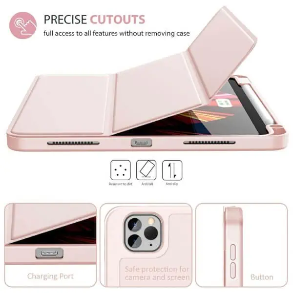 The smart folio stand offers multiple viewing angles for work, study, or entertainment. Precise cutouts allow full access to all buttons, ports, speakers, and camera without removing the case.