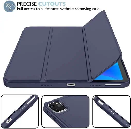 The smart folio stand allows multiple viewing angles for work, study, or entertainment. Precise cutouts provide easy access to all buttons, ports, speakers, and camera without removing the case.